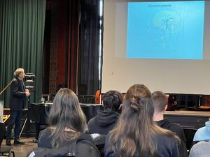 Nachdem die Schülerinnen und Schüler im vergangenen Semester die Inhalte zur Nerven- und Sinnesphysiologie erarbeitet haben, fand nun der Ausblick in die aktuelle Forschung statt. Ziel war es darzustellen, wie experimentelle und theoretische Forschung überhaupt erst zum Wissen führt, das in die Lehrbücher eingeht. Zusätzlich zu inhaltlichen Aspekten ging es auch um den Ausbildungs- und Lebensweg des Referenten und das Kennenlernen eines Professors, der Studentinnen und Studenten im Grundstudium unterrichtet. Nach einem spannenden Einblick in Wissenschaftsgeschichte und den aktuellen Stand der Forschung konnten die Schülerinnen und Schüler Fragen zu Fachinhalten und allgemein zum Studium stellen.