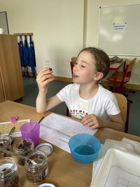 Am 11.3.24 hat ein Schokoladen-Workshop mit der Klasse 4d der Grundschule Staakenweg stattgefunden, am 1.6.24 und am 15.6.24 wurde der Workshop mit insgesamt 23 Kindern aus unterschiedlichen Schulen durchgeführt.Die Schokoladenforscher:innen haben den Weg vom Kakaobaum zur Schokolade kennengelernt, eine Geschmacksprobe von verschiedenen Schokoladen durchgeführt, die unterschiedlichen Bestandteile von Schokolade untersucht und grafisch dargestellt, Matheaufgaben gelöst, eine Temperaturmessung von flüssiger Schokolade vorgenommen und ihre eigene Schokolade hergestellt.
