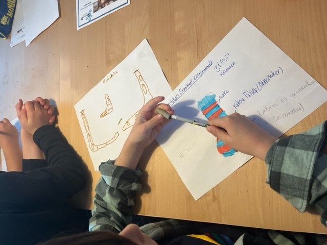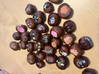Zum Schluss gab es noch eine Kreativaufgabe: Basteln mit Kastanien. Da gab es viele interessante Ideen. Eine Gruppe hat ein Memory aus den Kastanien hergestellt.